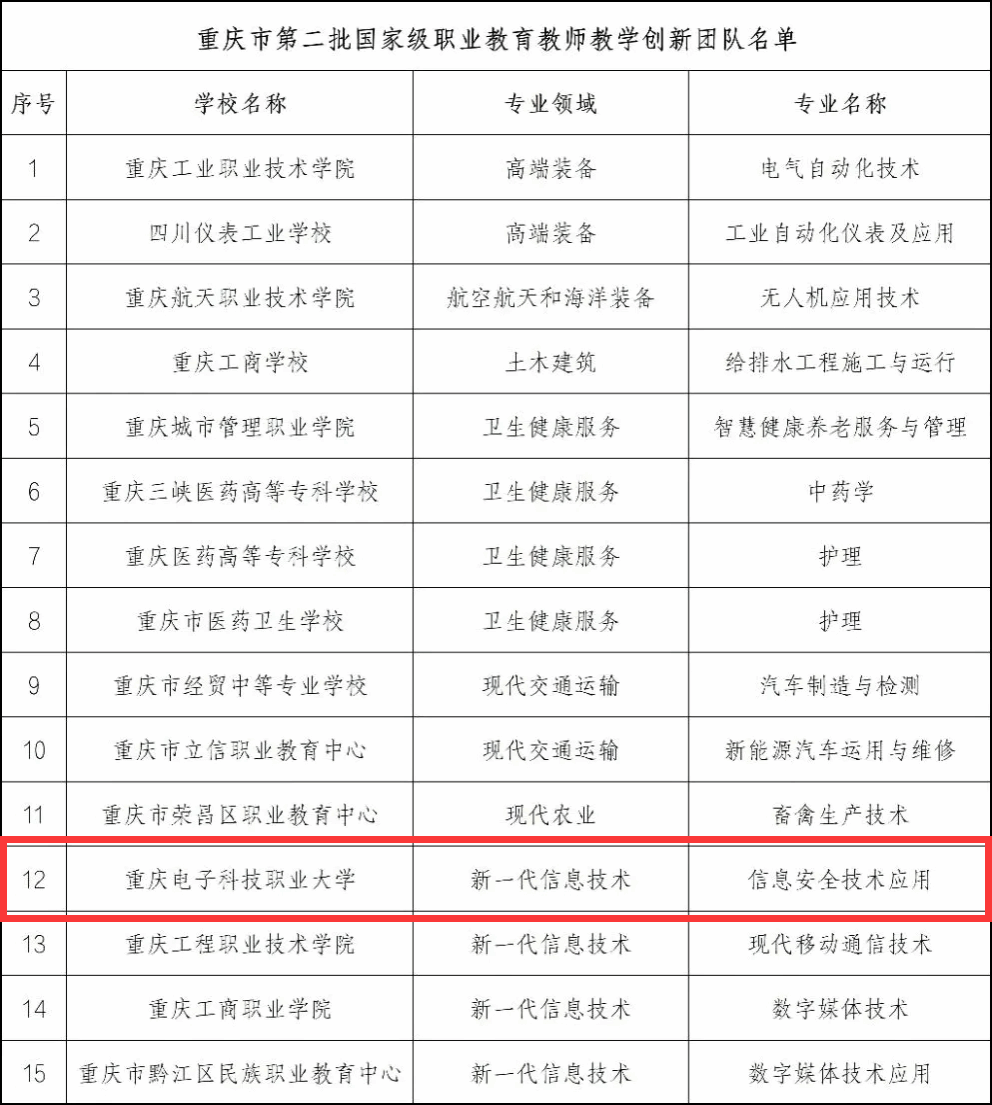 近日,教育部公布了第二批国家级职业教育教师教学创新团队名单,我校人工智能与大数据学院(网络空间安全学院)“信息安全技术应用”专业教师团队成功入选。