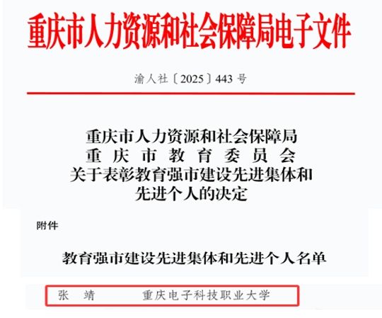 近日,重庆市人力社保局、市教委联合印发《关于表彰教育强市建设先进集体和先进个人的决定》,人工智能与大数据学院(网络空间安全学院)张靖老师荣获“教育强市建设优秀教师”称号。