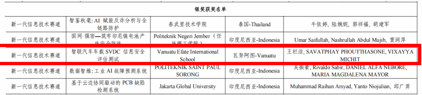 10月13日,2025年世界职业院校技能大赛总决赛争夺赛(国际组)获奖名单正式公示,本次国际组竞赛共有来自俄罗斯、德国、美国、阿根廷等73个国家的1446名参赛选手组成的434支参赛队伍参加了38个赛道的比赛。本届大赛以“技炫青春,能创未来”为主题由教育部等九部门联合主办。经过激烈角逐,由我校人工智能与大数据学院密码技术应用专业学生王栏洁,与瓦努阿图埃法特国际学校学生SAVATPHAYPHOUTTHASONE、VIXAYYA MICHIT共同组成的跨国参赛团队,凭借创新项目“智联汽车车载SVDC信息安全评估测试”脱颖而出,成功斩获大赛银奖。这一成绩标志着我校在该项国际高水平赛事中实现“零的突破”,是我校推进国际化办学与高技能人才培养的重要里程碑。