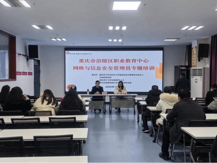 2025年12月10日下午,为进一步推动重庆市高技能人才培训基地建设,从源头提升专业建设水平,重庆电子科技职业大学鲁先志技能大师工作室领衔专家鲁先志应邀前往重庆市涪陵区职业教育中心,开展了一场主题为“网络与信息安全管理员专业师资培训”的专题讲座。