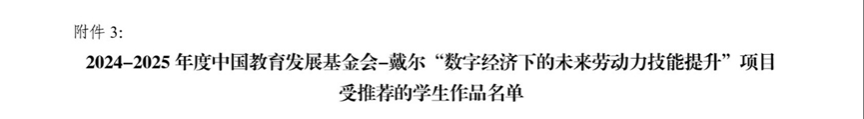 近日,2024-2025年度中国教育发展基金会-戴尔“数字经济下的未来劳动力技能提升”项目作品评选结果正式公布。该项目聚焦数字经济时代技能人才培养,吸引全国多所院校积极参与,评选标准严苛,极具行业认可度。我校人工智能与大数据学院精心组织报送的3件学生作品脱颖而出,全部斩获奖项,其中2项获评最高等级的“标杆作品”,1项获评“典型作品”,充分展现了我校在资讯安全领域的专业教学实力,获得全国评审专家的高度认可。