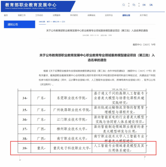 2025年12月18日,教育部职业教育发展中心公布职业教育专业领域垂类模型建设项目(第三批)入选名单,其中,重庆电子科技职业大学人工智能与大数据学院(网络空间安全学院)何欢教授领衔申报的“人工智能专业领域垂类模型及其应用体系建设”入选人工智能专业领域项目。