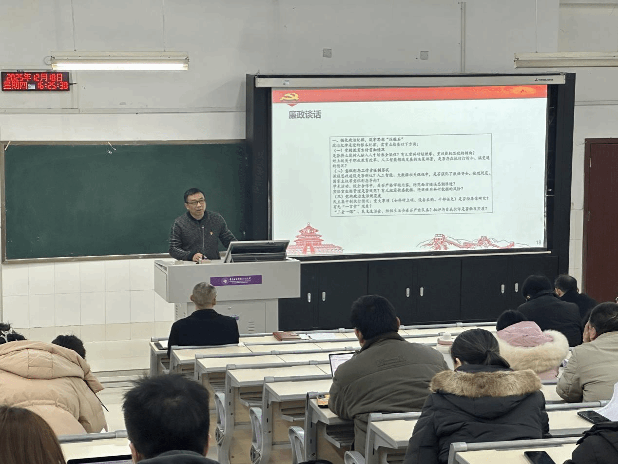 12月18日,人工智能与大数据学院(网络空间安全学院)在博德楼B131召开全面从严治党暨“以案四说”警示教育大会,全体教职工参会,会议由党总支书记吴焱岷主持。
