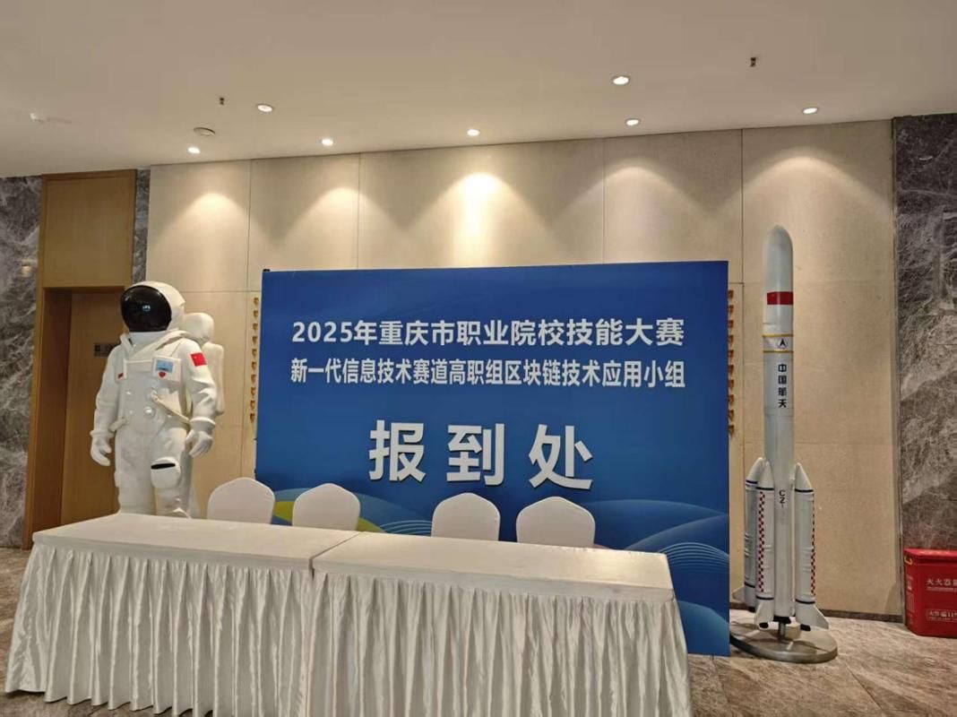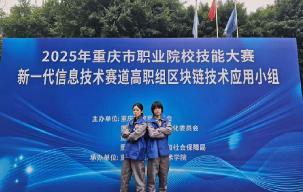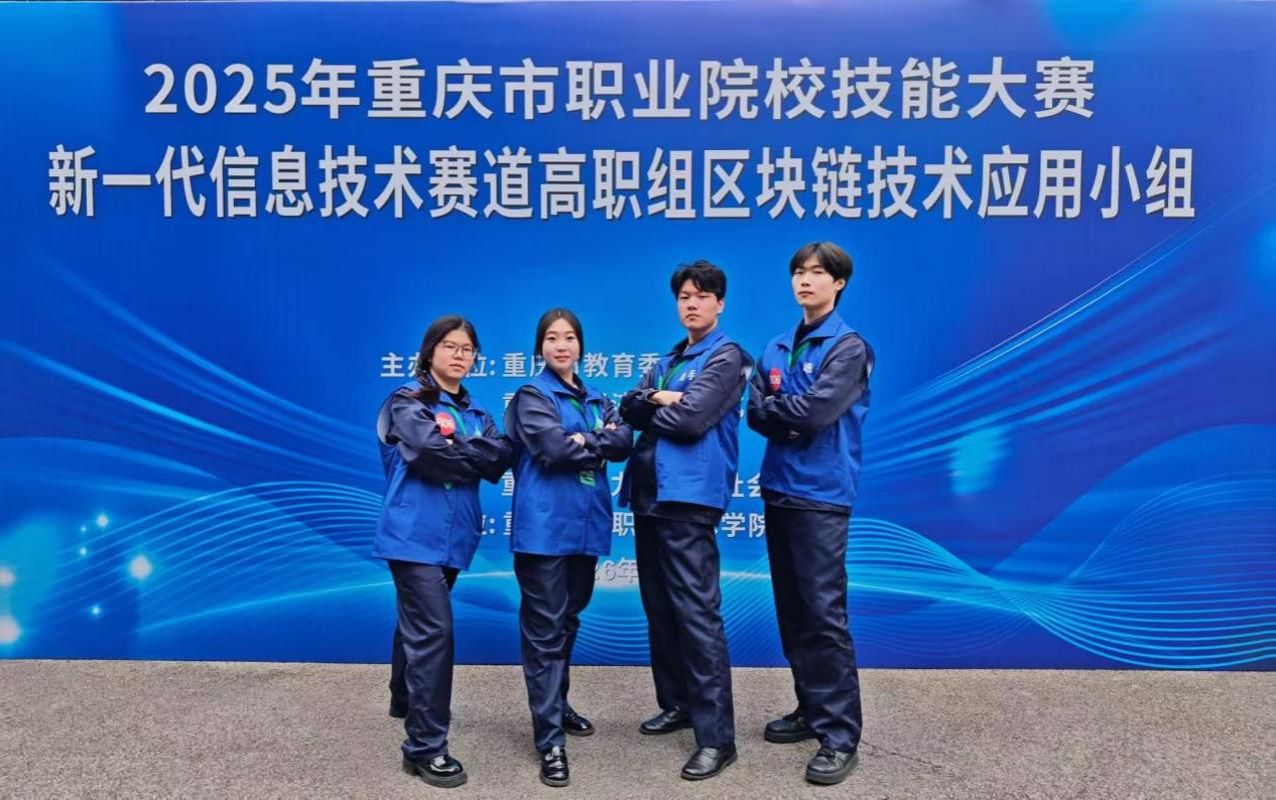 2026年1月23日至1月25日,由重庆市教育委员会、重庆市经济和信息化委员会、重庆市财政局、重庆市人力资源和社会保障局联合主办,重庆航天职业学院承办的2025年重庆市职业院校技能大赛新一代信息技术赛道(高职组)区块链技术应用赛项在重庆航天职业学院(江北校区)举办,我校区块链技术应用专业学生参赛,并客场夺得金奖一项。